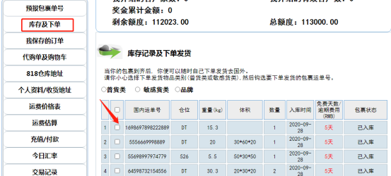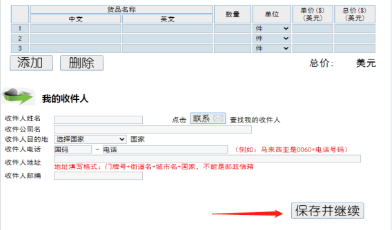 选择你需要的到库包裹或者未入库包裹,然后选择性质,填写申报,填写地址等信息,按保存并继续